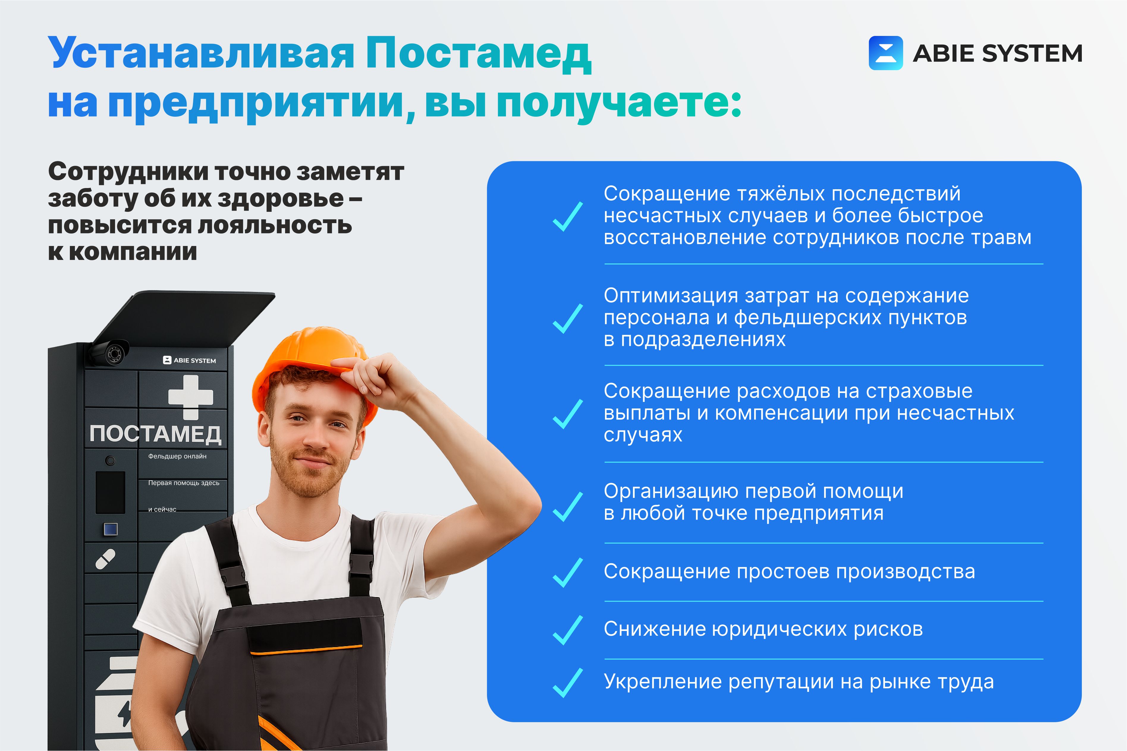 В рамках выставочной программы Всероссийской недели охраны труда–2025 было представлено технологическое решение для оказания первой помощи на производстве. ABIE ПОСТАМЕД - аппарат, разработанный совместно российскими компаниями ABIE System и DION, позволяет обеспечивать поддержку сотрудников даже при отсутствии медперсонала.