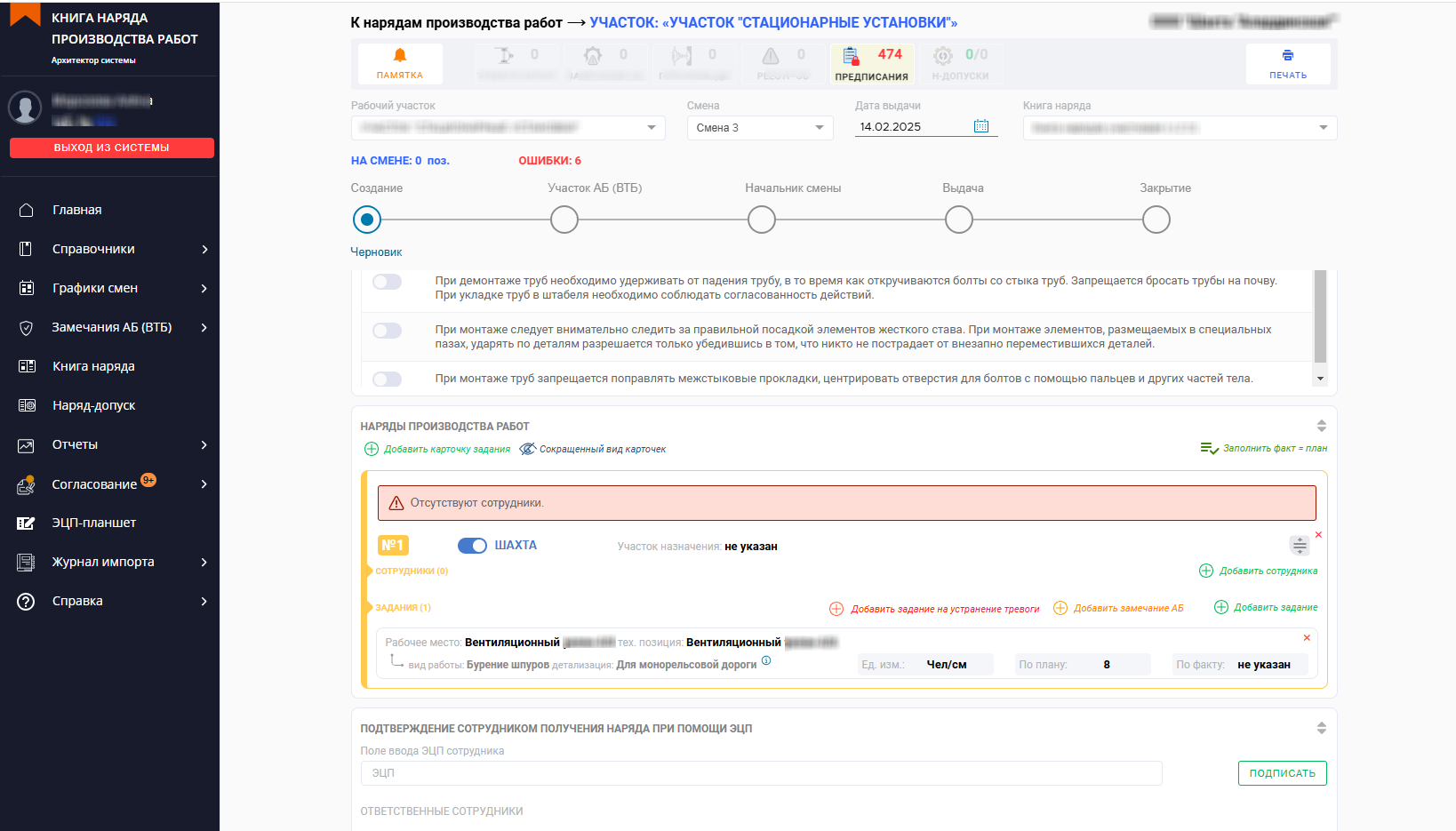 Оформление наряда в электронном виде через ABIE НАРЯДЫ, создает барьеры для ошибок, связанных с человеческим фактором. Система проверяет допуск, квалификацию работников, наличие СИЗ и прохождение медосмотров. Интеграция с модулем ABIE ТЕСТИРОВАНИЕ позволяет проводить предсменное тестирование по технике безопасности, подтверждая знания сотрудников. Электронная система ABIE НАРЯДЫ также обеспечивает оперативное реагирование на нарушения, снижая риски аварий и повышая безопасность при выполнении работ повышенной опасности.