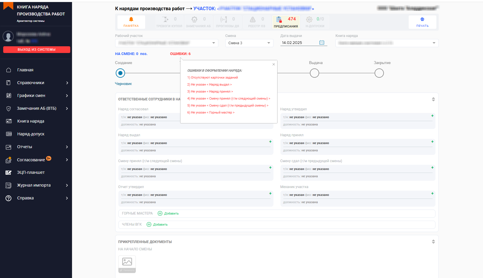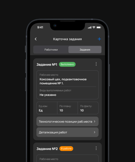 Система подтягивает информацию с производственной площадки (данные с датчиков, контроллеров, машинное зрение, лидарное сканирование, план производственных работ, техническая документация и т.д.), на основе чего формируется наряд-задание. Каждому наряду присваивается свой уникальный QR-код.