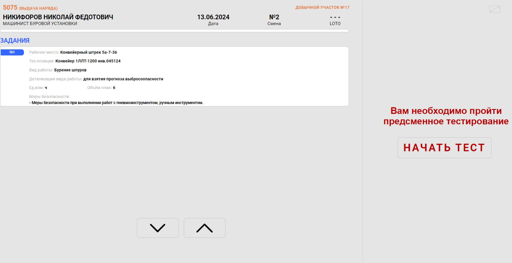 Система интегрируется с модулем ABIE ТЕСТИРОВАНИЕ, где работник с помощью мобильного приложения (ПК или планшета) проходит предсменное тестирование по производственному заданию, технике безопасности и, тем самым, подтверждает необходимые знания. Система предлагает пройти тест как планово, так и в момент подписания наряд-задания.