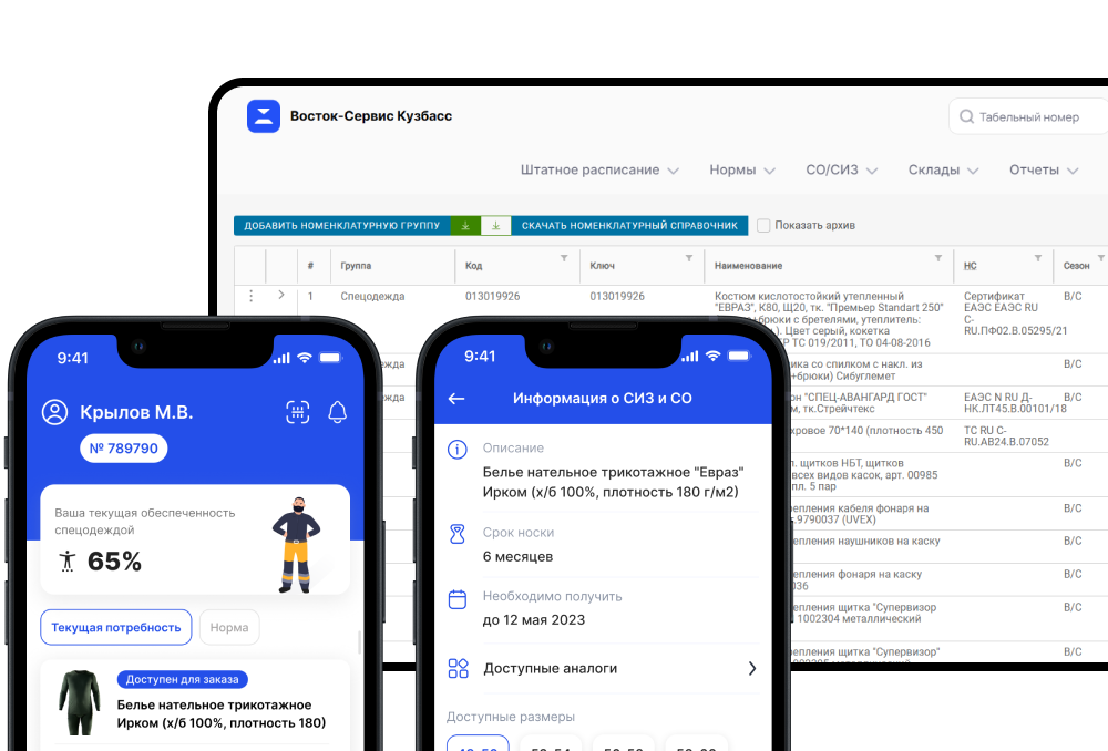 Система хранит данные о производителях и поставщиках спецодежды и СИЗ, сертификаты, защитные свойства, учитывает правильность маркировки и сроки годности.