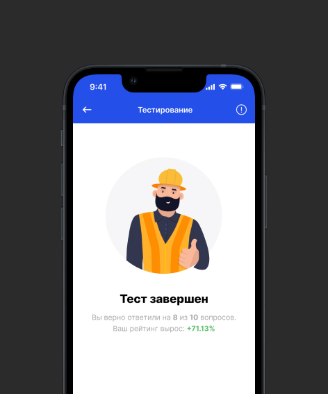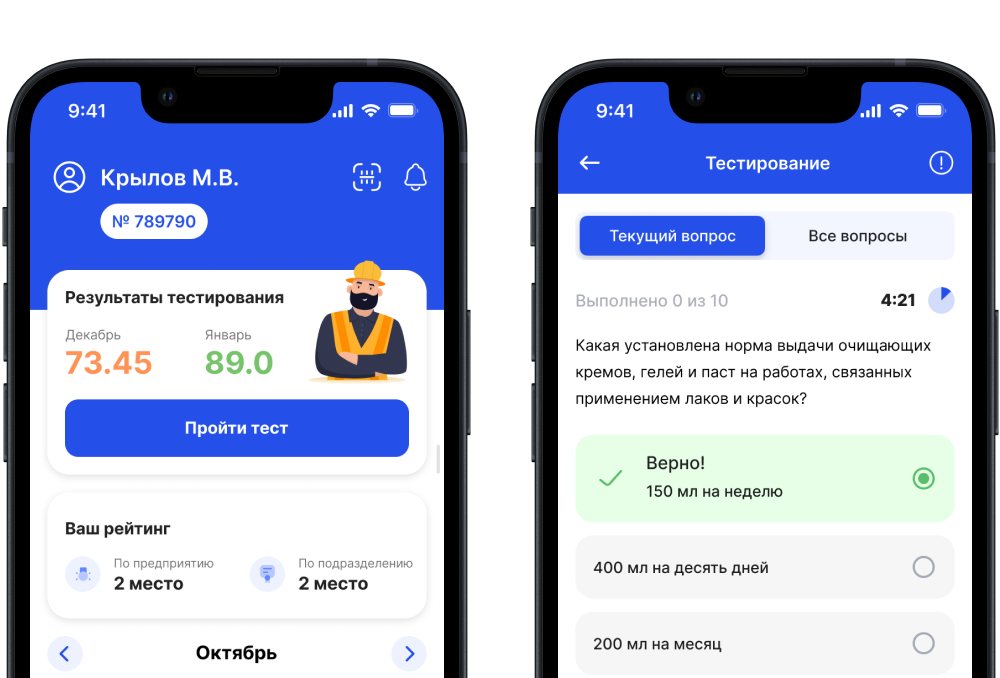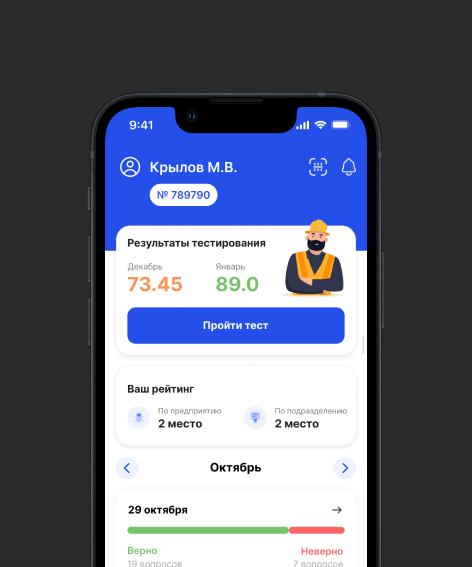 Работник заходит в мобильное приложение (web версию) и проходит тестирование, предназначенное именно для него